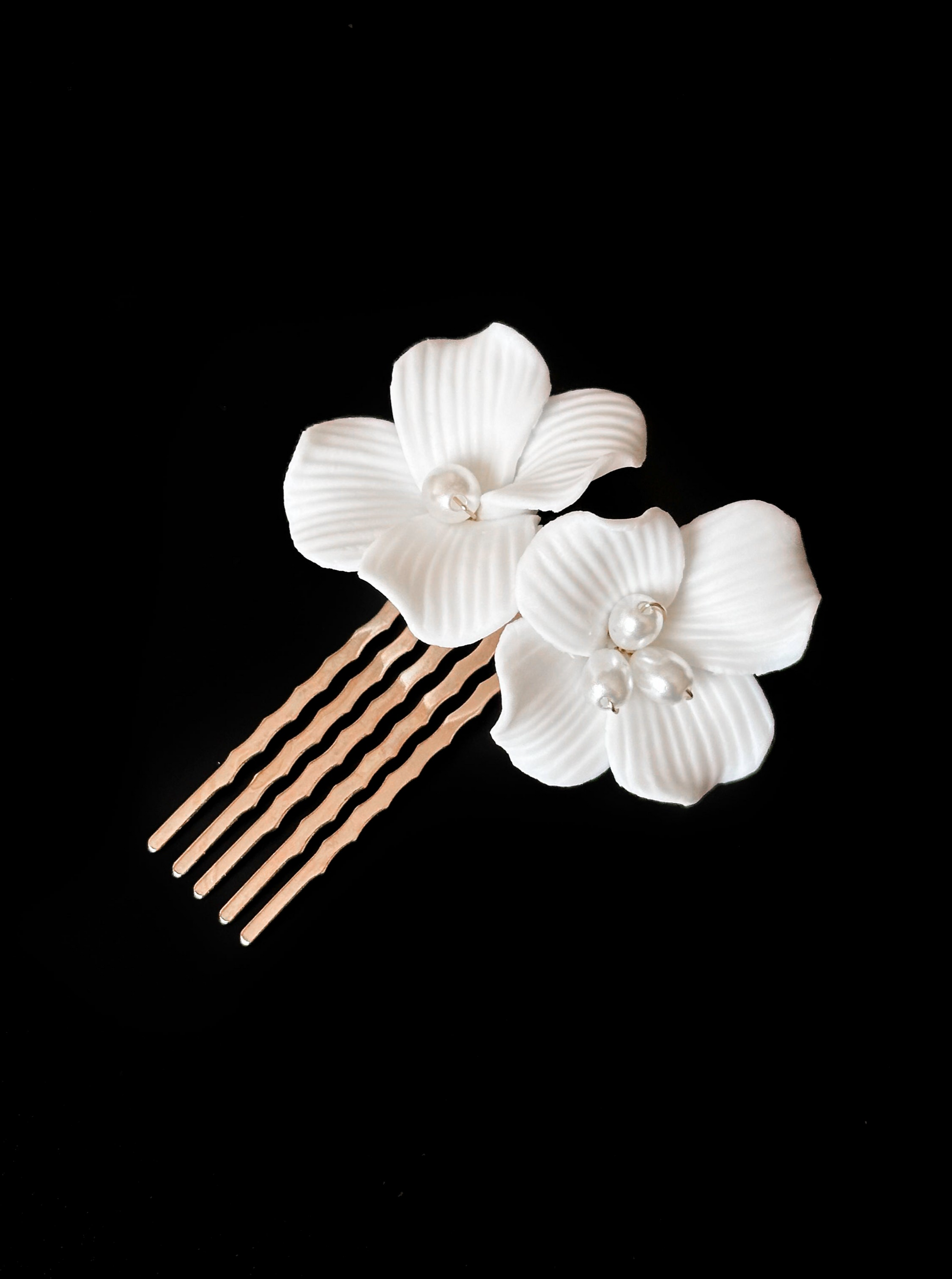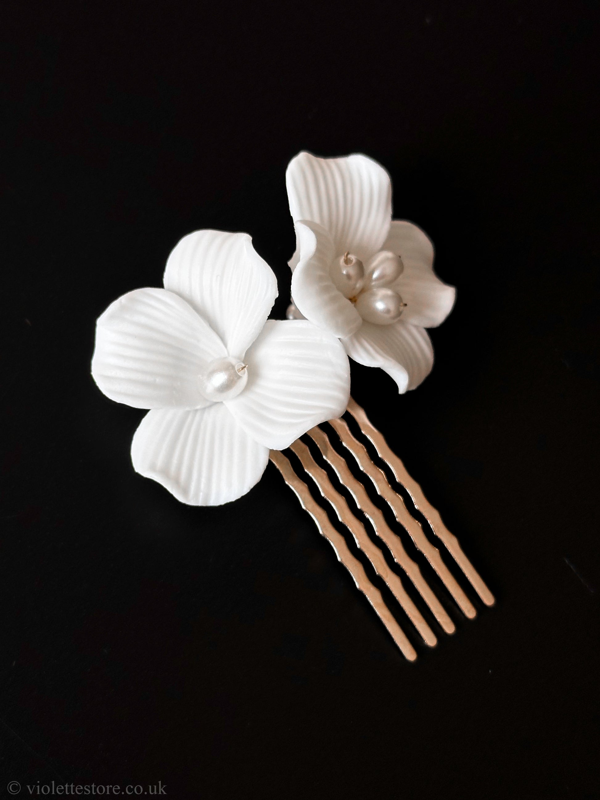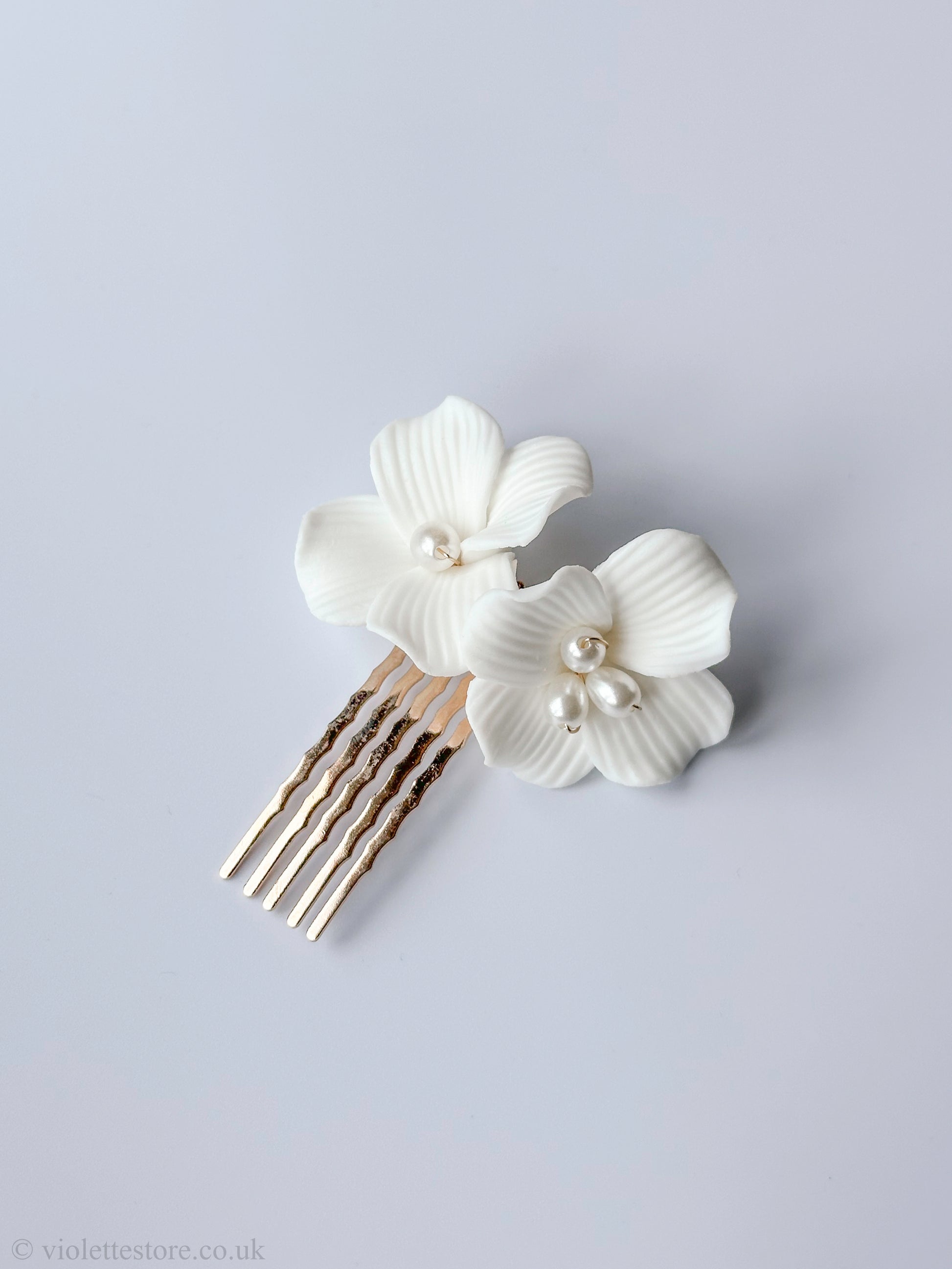 Beautiful and delicate, our comb features handmade ceramic flowers and pearls, perfect for a floral bridal look.
